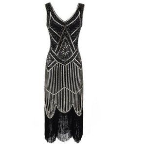 Women's Vintage 1920's Sequin Beaded Tassels Hem Flapper Dress with Accessories Stretch Fabric Great Gatsby Party Dress 100% polyester Elegant beads, sequins embellished stripe and embroidery flower pattern; Sexy V neck; Double-layered fringe irregular hem, moves beautifully during walking or dancing; Side zipper closure. Vintage styling flapper long dress right off the roaring 20s runway! Good for the Great Gatsby themed party, makeup costume, proms, homecoming, garden reception, 1920s wedding, anniversary, formal party, or any other special occasion. BLACK SILVER COLOR