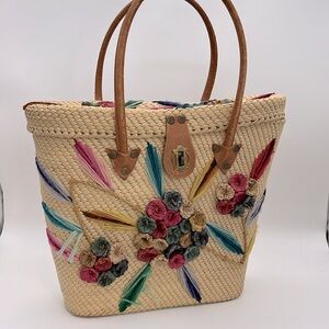 RARE!! vintage beautiful and unique tote handbag embroidered straw bag with applied floral detail approx 10” x 13” x 3” , drop 5.75” leather handle