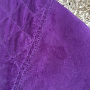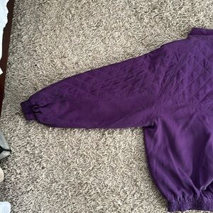 80s track pant suit, shimmer purple fabric, Jacket has Discoloration on Right Sleeve down and on the back, Shoulder pads are a little bit off, few stains on jacket most are pictured above, pants and jacket fabric does have a shimmer to it. So pant look like they have stains but don’t at times.
