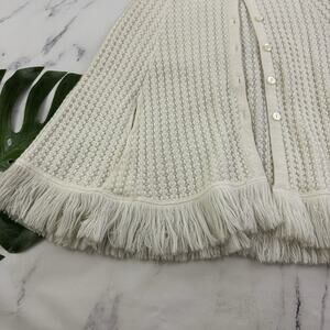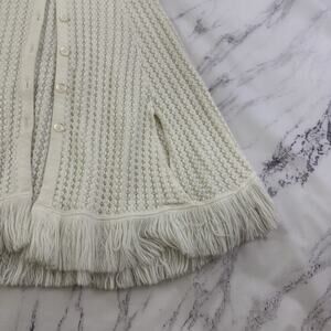 Women's vintage 60s cream crochet knit fringe trim poncho shawl sweater, one size. It is free from any rips or stains. It measures about 23 inches across the chest and is about 34 inches long.
