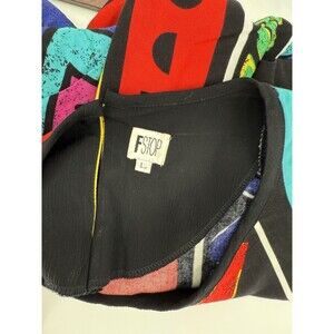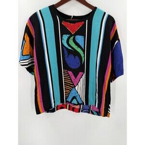 This Women's Vintage 80's F STOP Graphic Print Short Sleeve Top in size LARGE is a retro throwback to the Y2k era. Made from a polyester/rayon blend, this pullover blouse features a round neckline, shoulder pads, and a relaxed fit. The geometric pattern and multicolor design give it a unique vintage appeal, perfect for casual outings, parties, or workwear with a touch of nostalgia. Machine washable and suitable for all seasons, this blouse is a stylish addition to any wardrobe looking to add a touch of 80's flair.