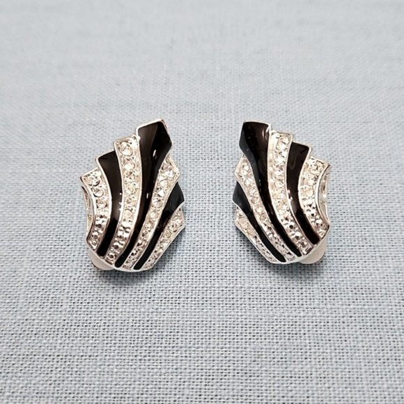 Black Enamel and silver color with crystal accents. Pretty and unique.