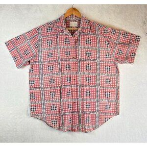 Vintage button up shirt by Fitting Image. All cotton, short sleeves with fun heart print on checkered background; patriotic colors in red, white and blue. One, open pocket on the upper left side. Good condition, showing moderate wear for a vintage piece.