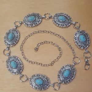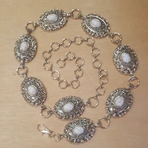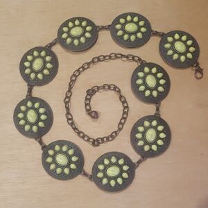 This Women's Vintage Chain Link Belt in gold tone is a stylish accessory with a retro 80s theme. The adjustable belt adjusts from 26-36 inches, making it versatile for different sizes. The geometric pattern and designer character add a touch of sophistication, while the gold-plated hardware and medallion accents give it a luxurious look. This chain belt is perfect for adding a chic and vintage flair to any outfit.