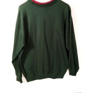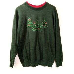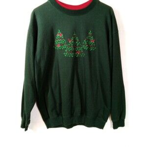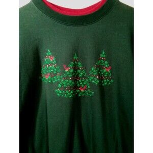 This women's vintage Christmas sweatshirt features a festive design with a tree and cardinal pattern, perfect for holiday attire. The medium size sweater is a pullover style in a green color, ideal for adding a touch of sprightly seasonal charm to any outfit. The shoulder hanger stain adds a unique and whimsical element to this classic Christmas sweater.
