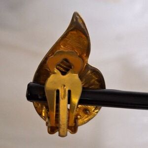 This a very elegant pair of gold tone women's clip on earrings. They are approximately 1.25" long. These have a very sweeping aesthetic that is very reminiscent of the mid-century modern jewelry. They are in very nice pre-owned condition, and appear to be quality made although they are not marked.