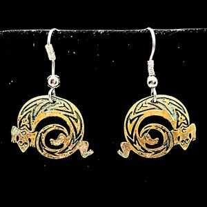 • Swirl Iguana dangle earrings with fishhook backing, mixed metal craftsmanship, intricate artistic patterns