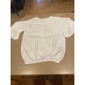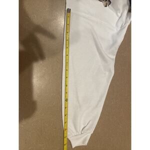 The crew neck sweatshirt is very thin and lightweight size medium, sleeves seem to be 3/4 length and this has two small spots on the shoulder, pants are stretchy size small, inseam 24” so a Capri length