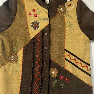 Women's Vintage GRAFF Cardigan Sweater Brown Tan Patchwork Embroidered Size L