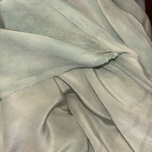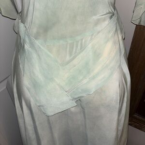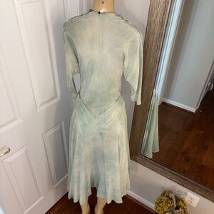 Beautiful vintage dress, custom no fabric or size tags but seems to be a good medium. Pullover style and lots of detail. I’m not sure on the fabric but is very flowy. The bust is approximately 39/40 “ and the waist is 33” and the length is 53”. Beautiful dress!