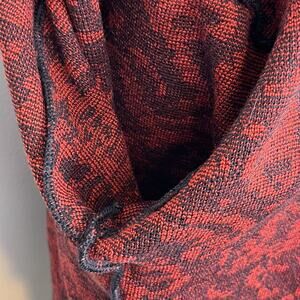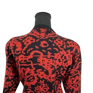 Description:This vintage Jaeger cardigan features a vivid red-on-black abstract pattern that dances between floral, animal, and geometric realms in 100% wool. The round neckline, long sleeves, and button-down front are trimmed in black, offering structure and contrast. Built-in shoulder pads add subtle structure and presence, evoking the power silhouette of late 1980s–early 1990s Jaeger tailoring. The back and side views reveal a full tapestry of symbolic shapes.