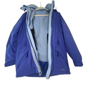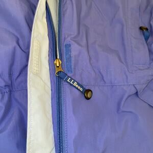 L.L.Bean hooded jacket. It features a full zipper, snap closures, and adjustable drawstrings at the waist and hem. The jacket has a light blue fleece lining.