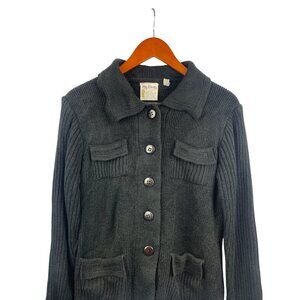 Embrace timeless style and comfort with this Ms. Doris vintage cardigan sweater. Designed with ribbed texture, it offers warmth and versatility. The button-up front and multiple pockets add practical charm, while the dark gray hue complements various outfits. Perfect for adding a touch of retro elegance to your wardrobe.