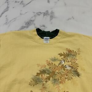 Women's vintage 90s yellow and green birds and fall leaves print grandma pullover sweatshirt, size M. It is free from any rips or stains. It measures about 44 inches around the bust and is about 26 inches long.