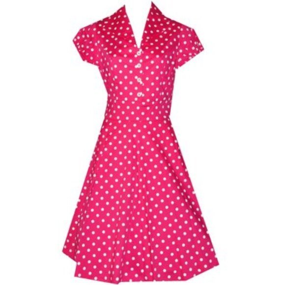 This slimming 1950s inspired swing dress features a classic polka dot print and a full knee-length circle skirt