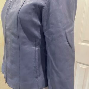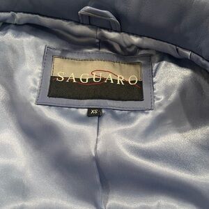 Elevate your style with this gorgeous chic blue vintage leather jacket by Saguaro. Size is XS. Perfect for any occasion, this tailored fit jacket offers both comfort and elegance. The 100% leather is buttery soft and the jacket is fully polysatin lined. Excellent pre owned condition. Zip front closure. Slit side pockets.