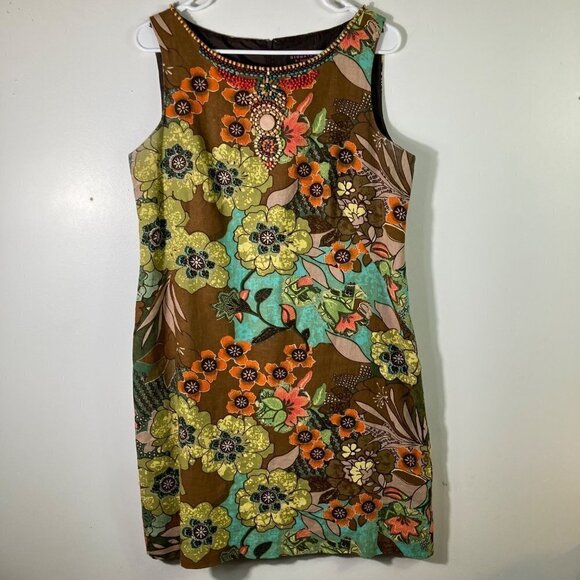 Womens Vintage Signature by Robbie Bee Dress Sleeveless Linen Blend Beaded Flora
