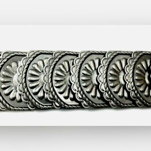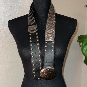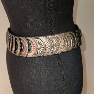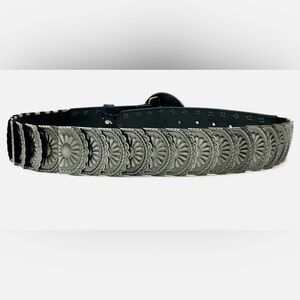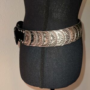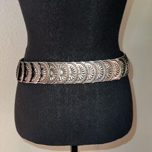 Women’s Vintage Silver Tone Coin Studded Stretch Belt 80s Shiny Disc Metal Cincher Vegan Leather Belt with Large Heavy Round Hammered Buckle. NEW without Tags! ****Missing 1 Disc - does not affect the purpose of the belt. Disc could possibly be moved to fill the small space****Styled on a size 4 mannequin**