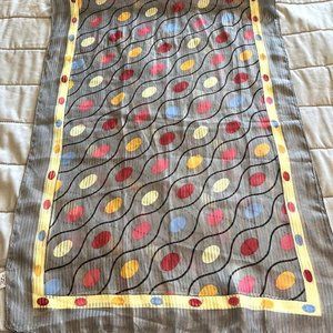 This beautifully crafted vintage oblong scarf with gray abstract design and silver metallic thread was perfect for the fashionable women of the 80s. The art deco style and multi-colors (gray, yellow, peach, pink, burgundy, blue & black) make it a versatile accessory that can be worn in various styles & paired with a variety of outfits. The unique design reminds one of Easter eggs making it great for Spring wearing. The scarf is made of high-quality polyester material and has been well-maintained with no holes, stains or snags. This one-of-a-kind piece is a great addition to a collection of vintage accessories. The scarf's country/region of manufacture is unknown, adding to its mystique and allure. Don't miss out on the chance to add this unique and stylish scarf to your wardrobe. This scarf measures 22" wide by 62" in length.