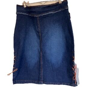 denim skirt, stretch fit, knee length, lace-up details, retro fashion, 90s style, blue denim, vintage inspired, Y2K aesthetic, zip accent