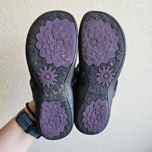 These flip flops are part of the Vionic product line and are designed for comfort, making them an ideal choice for all-day wear. The rubber outsole material provides durability, while the under 1 inch heel height ensures a comfortable fit. Available in US shoe size 7 and UK shoe size 5, these sandals are a must-have for any woman's shoe collection. Pre-owned condition. *1 stone missing, see pics.