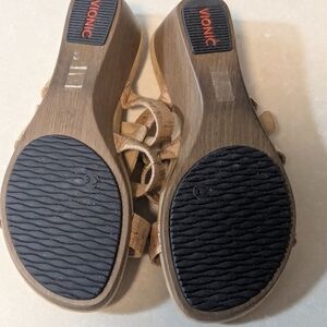 These are in almost new condition They have a cork look with gold hardware and adjustable straps. They have a soft foot bed and a 2" heel. Comes from a smoke and pet free home