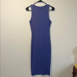 This elegant bodycon dress by Balance Athletica showcases a sleeveless design with a crew neck, ideal for both work and cocktail settings. The rich blue hue and seamless construction provide a sleek, sophisticated look, while the midi length adds a touch of refinement.