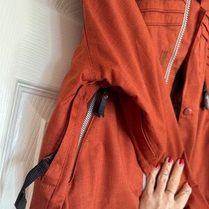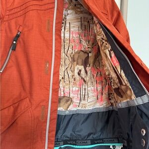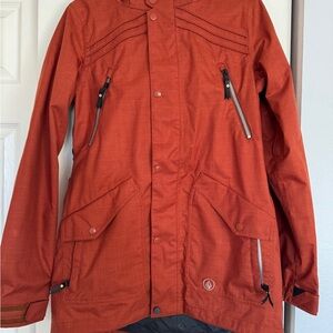 Stylish and durable women’s Volcom snowboard rust jacket, perfect for skiing and snowboarding. It has many cute zipper pockets and zippers in the armpits.