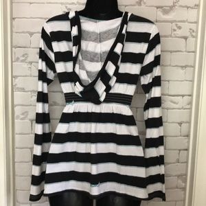 Long sleeve light weight too with a hood. Elastic waist, size medium. Black and white stripes with blue logo accents. 100% cotton.