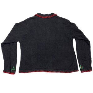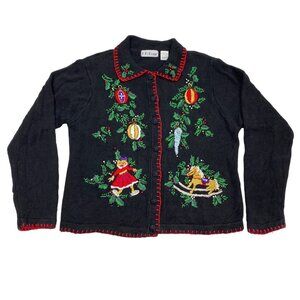 Vintage black Christmas cardigan sweater by B.P. Design, size Medium, features festive embroidered ornaments, holly, and toys with colorful beading. This charming holiday cardigan has a button-up front, red whipstitch trim, and cozy midweight knit made of 55% ramie and 45% cotton. Adorned with nostalgic holiday motifs like a rocking horse, doll, and icicle ornaments, it’s perfect for Christmas parties, layering over winter outfits, or ugly sweater events with a vintage twist. Made in China, this timeless piece adds cheerful charm to any seasonal wardrobe.