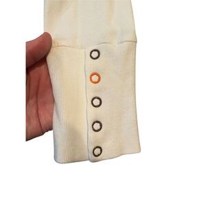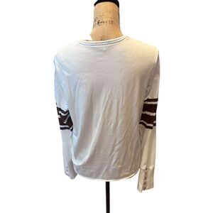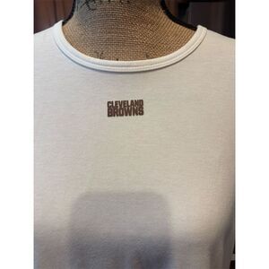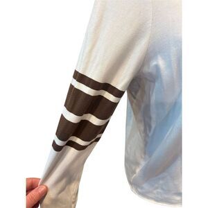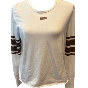 The Wear By Erin Andrews T-Shirt is a women's Standard large, slim-fit, long-sleeve top in cream with a striped pattern. Made from a soft tri-blend fabric, it features a crew neck and is officially licensed with stripe detail, perfect for showcasing team spirit. Ideal for casual occasions, especially during the fall season, this shirt is machine washable for easy care. It runs small, making it suitable for those who prefer a snug fit. This pre-owned item has a couple of small spots on the front. Keywords: Wear By Erin Andrews, Cleveland Browns, women's t-shirt, long sleeve, striped, sports theme, team spirit, casual wear, fall fashion, slim fit, crew neck, machine washable, officially licensed, pre-owned.