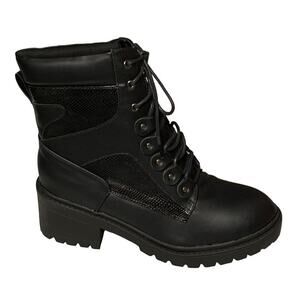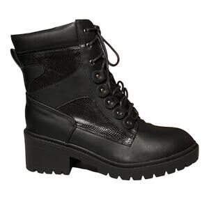 Crafted from high-quality faux leather, these boots are a perfect blend of style and durability. The gunmetal eyelets and lace-up closure add a touch of edginess, while the textured paneling provides a unique visual appeal. With a convenient heel loop and chunky style, these boots are as comfortable as they are fashionable.