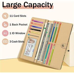 🧿Large Capacity: This thin wallet for women offers 11 slots for credit cards, 1 clear ID window, 3 sections for cash, and an external zippered pocket for coins. This credit card holder wallet offers ample space for bills, cards, cash, and even family photos. Even when filled with cards, the wallet remains slim, and the clasp opens and closes effortlessly. This slim wallet cannot hold phone