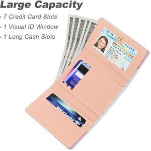 【Large Capacity】Slim wallet for women designed with 7 credit card slots, 1 visual ID window and 1 long compartment for cash, folded receipts. Each slot can hold 1 - 2 cards, perfect to holdyour credit card, business card, ID card, metro cards, shopping cards and more. Small size but large capacity, capacity for up to more than 14 credit cards or more than 28 business cards.