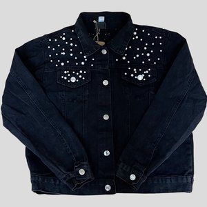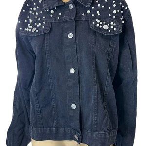 Womens Wash Denim Jackets Large Black White Mid Length Decorated With Pearls
