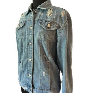 Womens Wash Distressed Ripped Destroyed Denim Jean Jacket Frayed Large 2