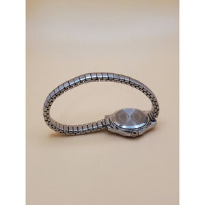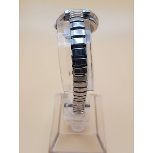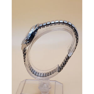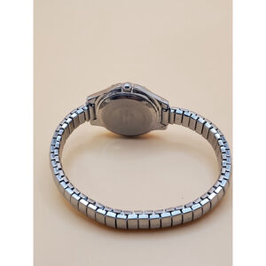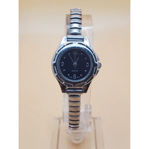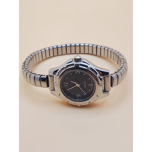 Womens 25mm Quartz Watch. Round Silver Tone Case and Expansion Band. Black Dial w/Silver Tone Numbers and Accents. New Battery. Pre-owned