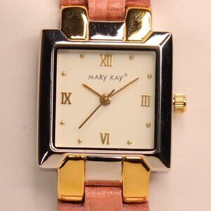 Lovely pink dress watch from the Mary Kay collection. This quartz analog watch features a silver tone vintage style case with a splash of gold tone. It has a pink simulated alligator pink band because pink pretty much goes with everything. This is new and has a new battery for you.