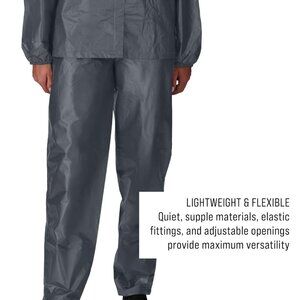 Features: This lightweight rain suit includes a jacket with an adjustable hood, full front zipper with storm flap, and elastic cuffs for a snug fit. The pants have an elastic waist and straight-leg design, plus a handy stuff sack for easy packing. Made from breathable, waterproof polypropylene fabric that keeps you dry without overheating.