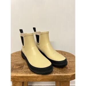 Women's waterproof rain boots in tan and black. Size 8 wide. Stylish and practical for rainy days. Only one pair available!
