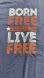 This navy blue tee prominently displays the empowering phrase "BORN FREE LIVE FREE" in bold red, white, and blue lettering, accented with a white star and red stripes