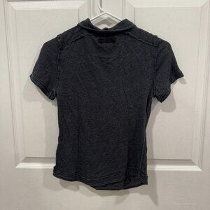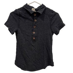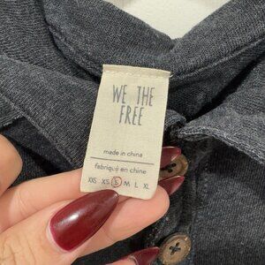 This is a women's We The Free pullover shirt in size small (S) with a distressed gray color. The shirt features a boho chill style and a pullover closure. It is a regular size type and falls under the polo type category. Perfect for a casual and laid-back look, this top combines comfort with a trendy distressed design that adds a unique touch to any outfit.