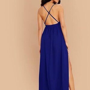 Elegant and chic navy maxi dress with a deep V neckline, sleeveless fit, and high side slit. Features a criss cross open back for a gorgeous statement look.