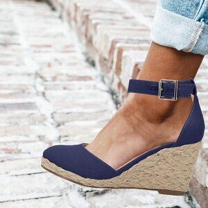 Features: Stylish espadrille wedges with a comfy platform and ankle strap for a secure fit. Faux suede uppers add a touch of elegance, while the plastic sole keeps it lightweight and comfy for all-day wear.
