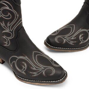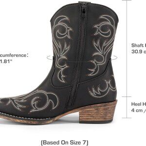 Features: Stylish ankle boots with vibrant embroidery that creates a vintage, cowgirl vibe. Cushioned with a comfy 4mm latex insole to support every step. Durable TPR outsole with a distressed, retro look for grip and longevity. Convenient inner zipper for easy on/off. Set on a chic 1.57-inch Cuban heel with a square toe, perfect to elevate any casual or dressy outfit.