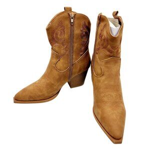 Womens Western Style Tan Ankle Boots With Embroidery & Block Heel Size 7