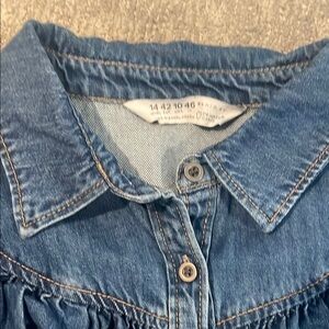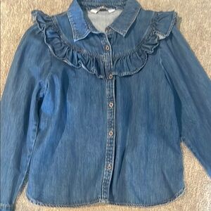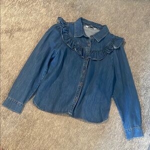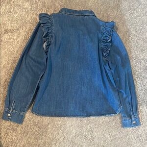 This elegant blue button down shirt features a charming ruffle trim around the neckline, adding a touch of sophistication to its classic design. The medium weight fabric ensures a structured silhouette, making it a versatile piece for various occasions.