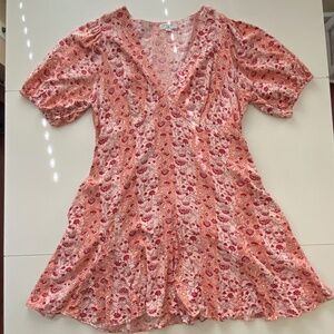 This is a pre-owned dress in excellent condition. A mini v-neck dress with a beautiful Whimsical floral-print in blush and red