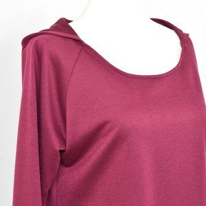 Solid burgundy brick red pullover long tunic with raglan long sleeves, round neckline with fixed hood,