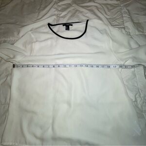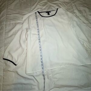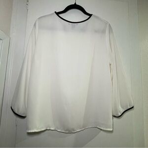Elegant white blouse with black trim, perfect for any occasion. Sheer fabric perfect for an office siren look. Size L. Features a classic design that pairs well with any outfit. Excellent preowned condition- never worn.